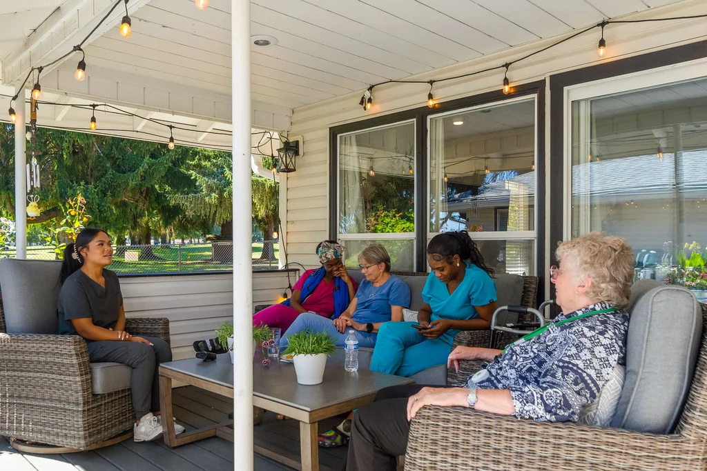 Although we care for residents with a wide range of needs, we have developed a strong focus on dementia care. With engaging memory-care activities we’ve seen real improvements in cognition and interaction. With a high staff ratio—one caregiver for every three residents—personalized care isn’t an aspiration, it’s our everyday practice. Every care plan is shaped in consultation with healthcare professionals to ensure the best path for each resident.When we designed Evergreen Haven we wanted it to reflect the beauty of the Pacific Northwest. Big windows pull in natural light and frame the trees that surround the property. Plants fill the rooms and the garden has become a favorite gathering place for residents and staff.